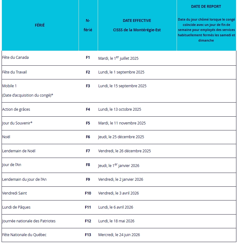 Document générale Calendrier_d_affichage_CISSSME_2025-2026_-_Tous_MOFIDIE calendrier des jours fériés 2025-2026 Calendriers_confection_d_horaire__employe_2025-2026_17-01-25 Calendriers_confection_d_horaire__employe_2026-2027 Liste_des_codes_de_paie Formulaire de réclamation manque a gagner (1)